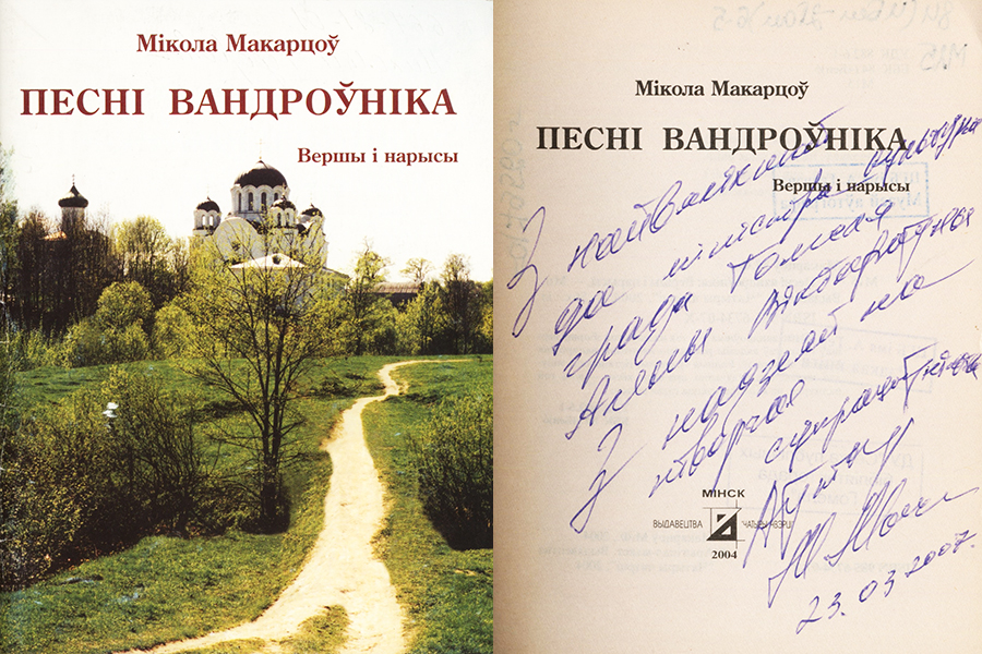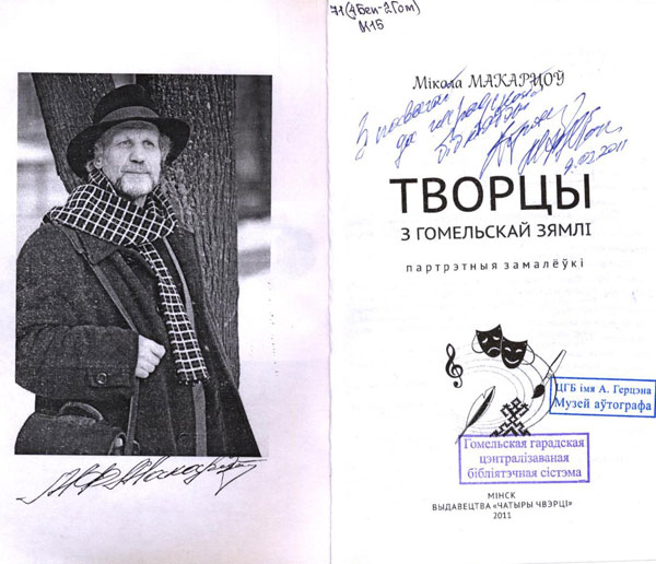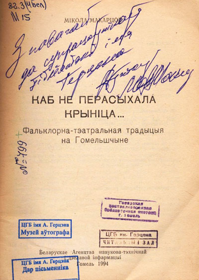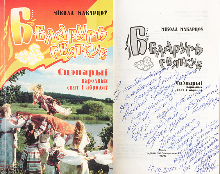 З найвялікай павагай да спадарыні Алёны Фёдараўны пакупніцы кнігі, якая будзе адраджэнскім подыхам святочнай культуры беларусаў. Пашана вялікая пакупніцы, што маючы адукацыю эканаміста не абыякава да нараджэння мастацтва. Аўтар /Подпіс/ 17.04.2000