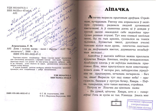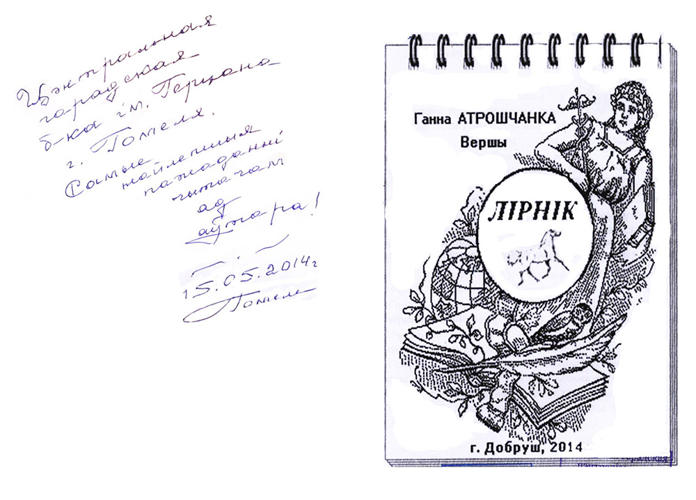 В 2009 году отмечена поощрительным дипломом в областном литературном конкурсе «Пад мірным небам – 65 вёсен!» и благодарственной грамотой в III областном литературном конкурсе им. К. Туровского за книгу прозы «Арыёза жыцця».
