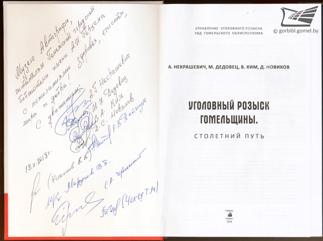 Книга была подарена центральной городской библиотеке имени А.И. Герцена Управлением уголовного розыска УВД Гомельского облисполкома 19 ноября 2018 года на презентация тематического номера литературно-художественного журнала «Метаморфозы», посвященного 100-летию службы уголовного розыска Гомельщины, которая проводилась совместно с Гомельским областным советом ветеранов органов внутренних дел и внутренних войск, автографы взяты на презентации.