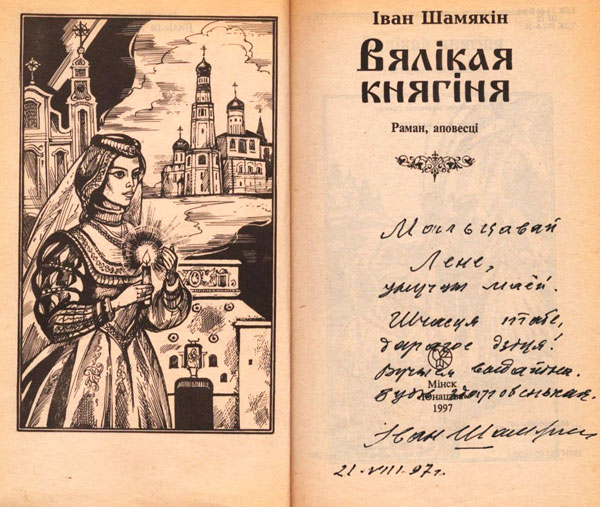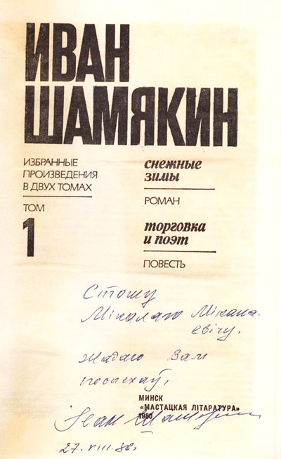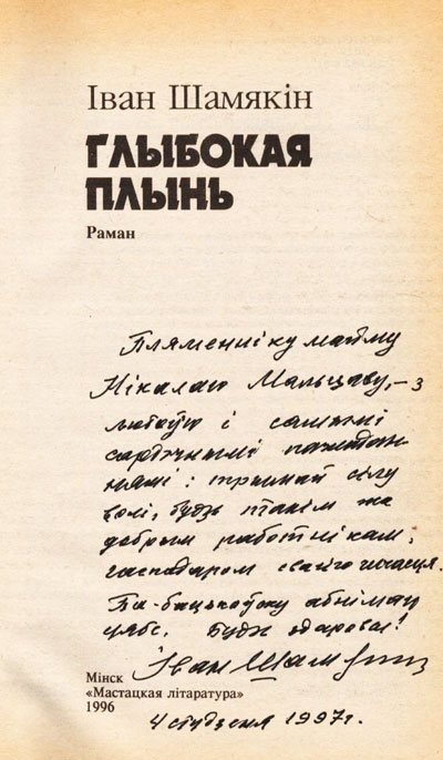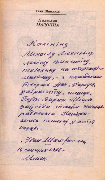 Калініну Міхаілу Аляксеевічу, майму пляменніку, таварышу па творчасці – мастаку, - з пажаданнямі творчых удач, здароў’я, дабрабыту, шчасця. Будь, дарагі Міша, заўсёды панам жыцця, радасным. Настрой – аснова поспехаў у любыой справе. Іван Шамякін