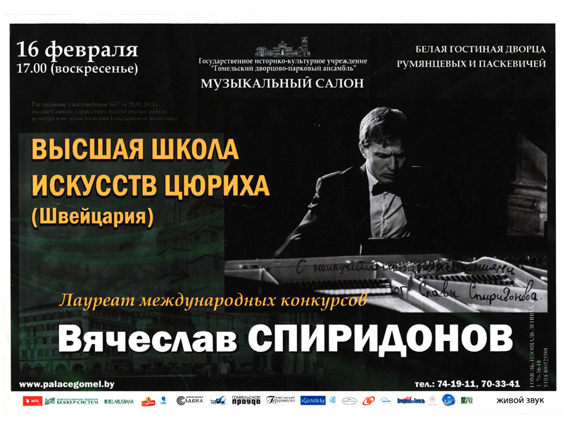 Родился в Беларуси. Окончил белорусскую государственную академию музыки, учился в магистратуре и ассисентуре Высшей школы искусств в Цюрихе. С 2013 года продолжает обучение в г. Берн. Вячеслав Спиридонов – лауреат международных конкурсов, стипендиат Специального фонда Президента Республики Беларусь по поддержке талантливой молодежи. Он – участник различных престижных фестивалей за рубежом (США, Франция, Швейцария, Германия).