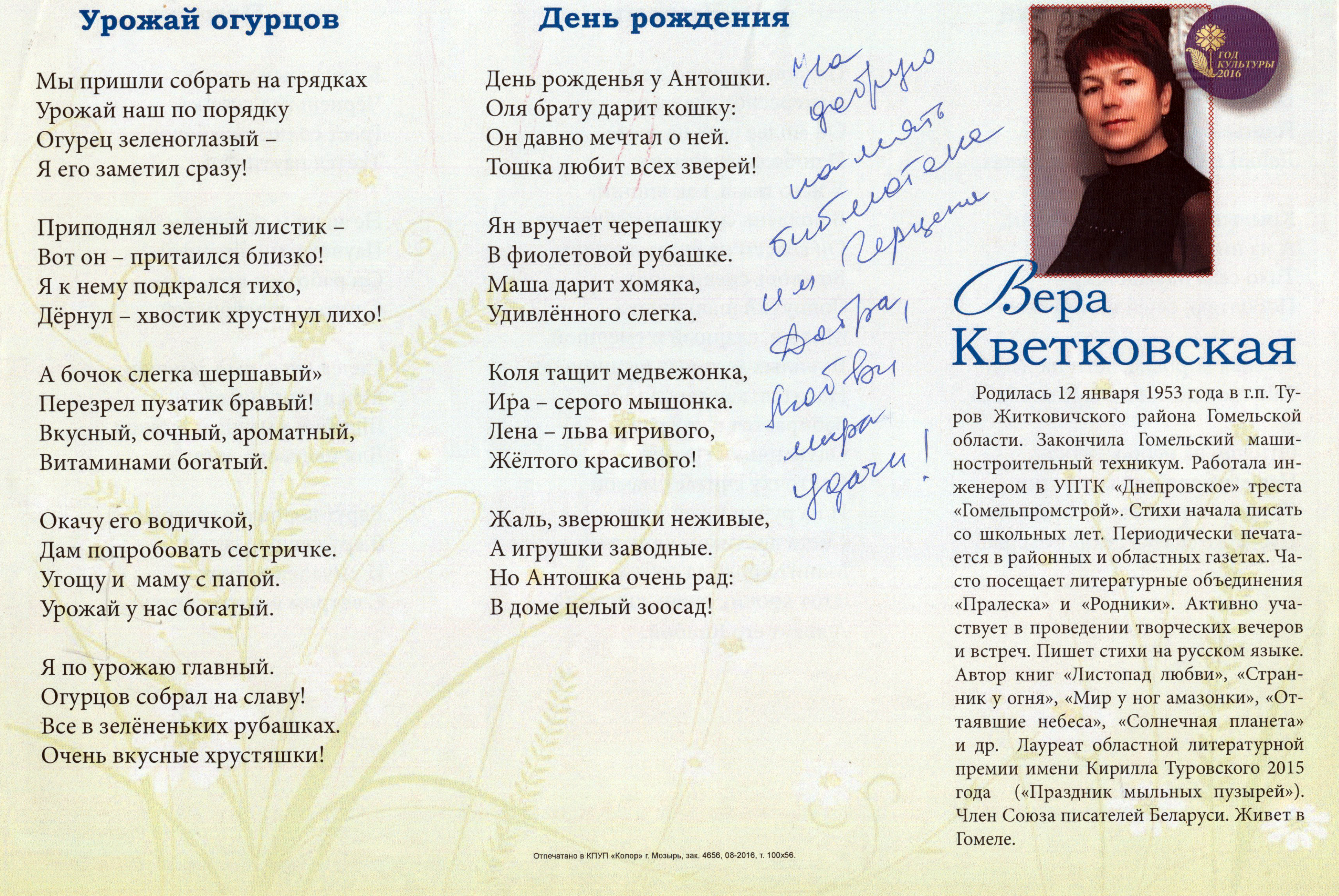 Стихи Веры Кветковской для детей дошкольного и младшего школьного возраста пронизаны солнечным светом, наполнены истинно ребячьим озорством и радостью. В милых незамысловатых строках живёт самая настоящая доброта и мудрость взрослого человека, в душе которого вечно будет купаться в воспоминаниях детства солнечный ребёнок.