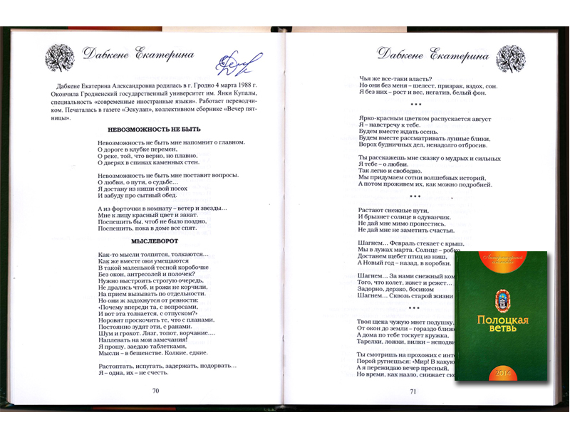 Дабкене Екатерина Александровна родилась в г. Гродно 4 марта 1988 г. окончила Гродненский государственный университет им. Янки Купалы, специальность «современные иностранные языки». Работает переводчиком. Печаталась в газете «Эскулап», коллективном сборнике «вечер пятницы».