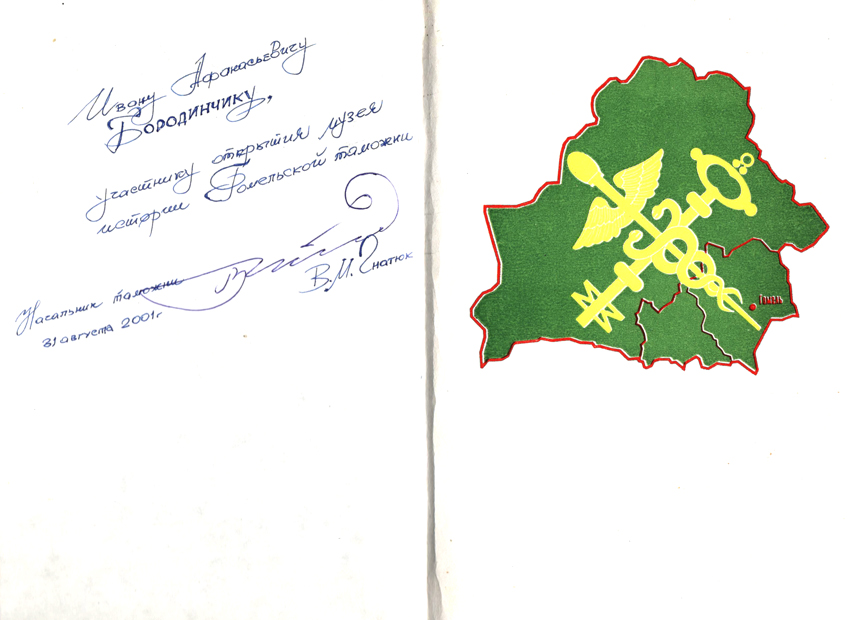 Ивану Афанасьевичу Бородинчику, участнику открытия музея истории Гомельской таможни. Начальник таможни /Подпись/ В. М. Гнатюк 31 августа 2001 г.