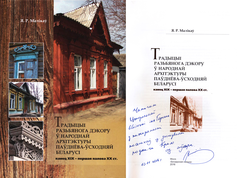 В ноябре 2016 г. в центральной городской библиотеке им. А.И. Герцена состоялась презентация книги Евгения Маликова «Традыцыі разьбянога дэкору ў народнай архітэктуры паўднёва-ўсходняй Беларусі: канец XIX — першая палова XX стагоддзя». Книга вышла в сентябре 2016 года в РУП «Издательский дом „Белорусская наука“» (г. Минск) и стала результатом почти 20-летней кропотливой работы автора над изучением резного украшения деревянных домов Гомеля и области. Фактически эта книга открывает научному миру и обществу новую неизученную сферу народной культуры Гомельщины — богатейшую традицию резного архитектурного декора, по своим художественным качествам идущей в одном ряду с традициями ткачества и иконописи. На презентации автор оставил автограф на своей книге для музея автографа центральной библиотеки.