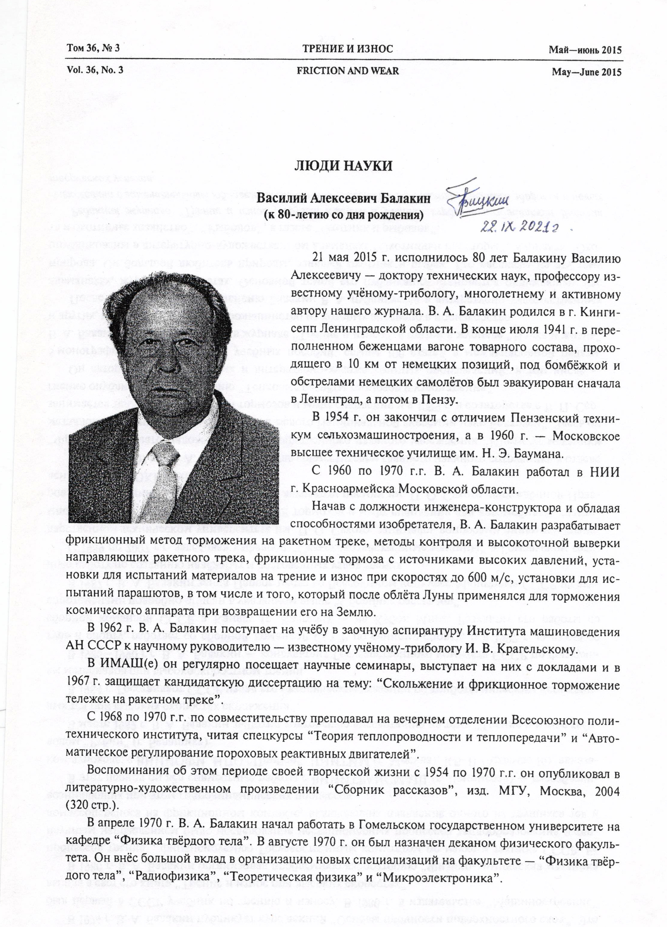 Василий Алексеевич Балакин (род. 21 мая 1935г.) – профессор, доктор технических наук, изобретаель, публицист, популяризатор науки.