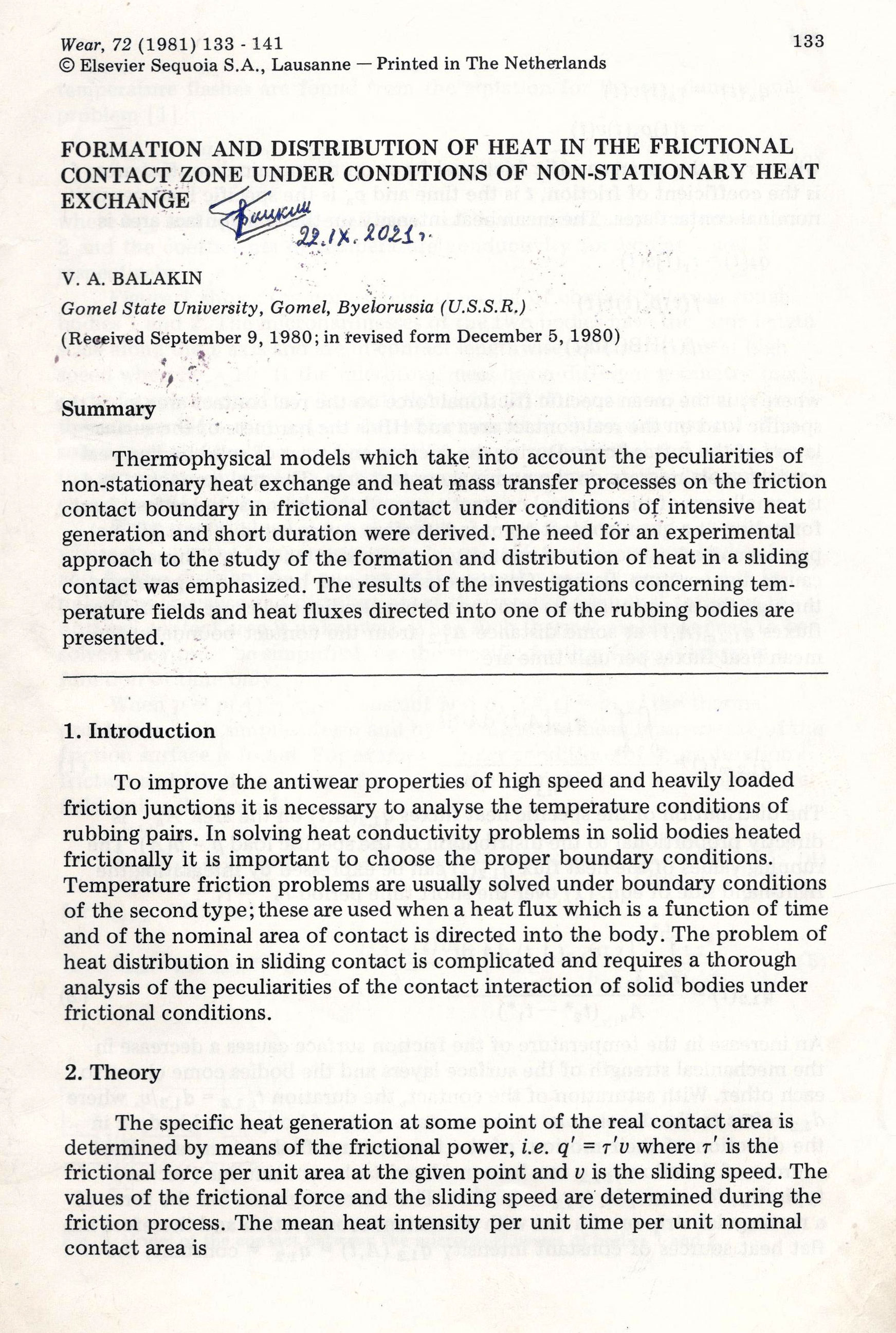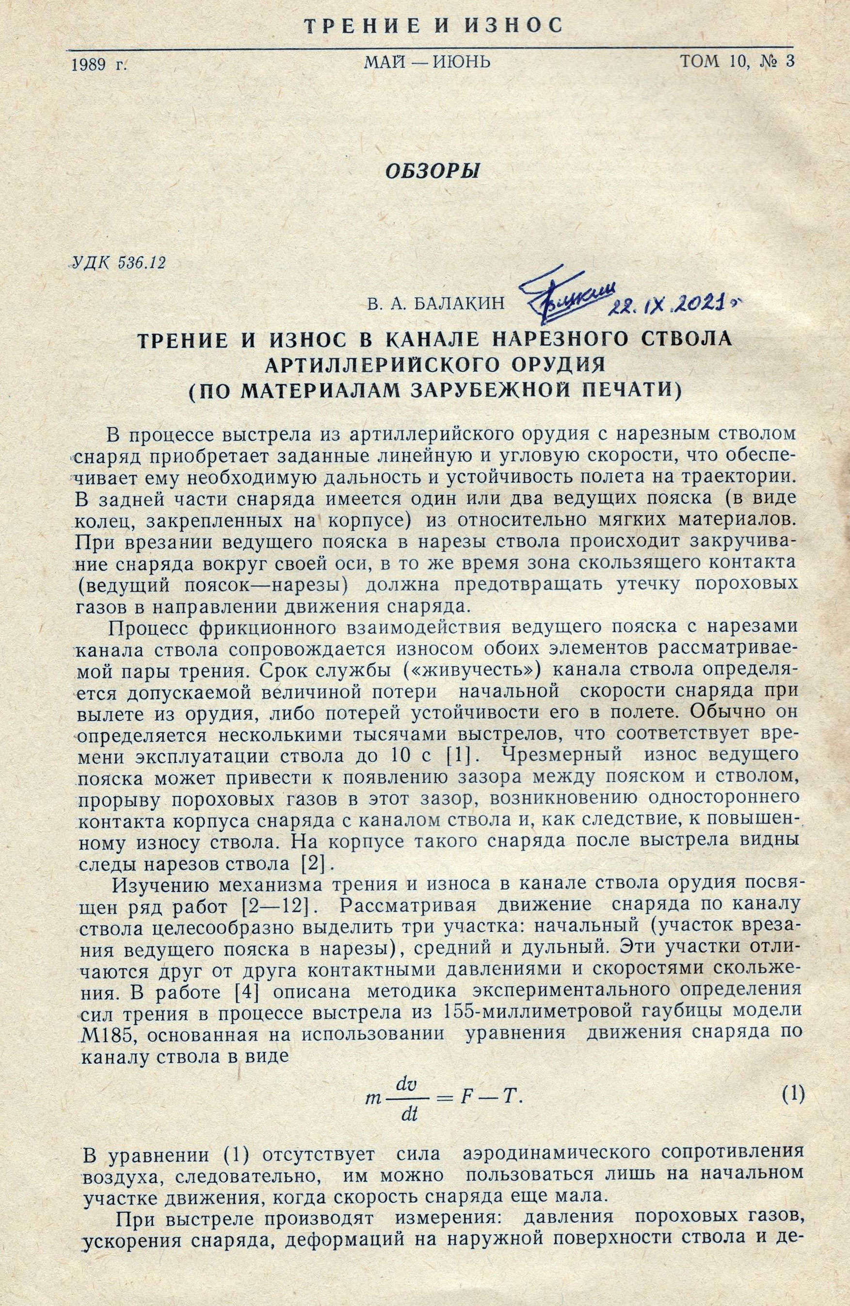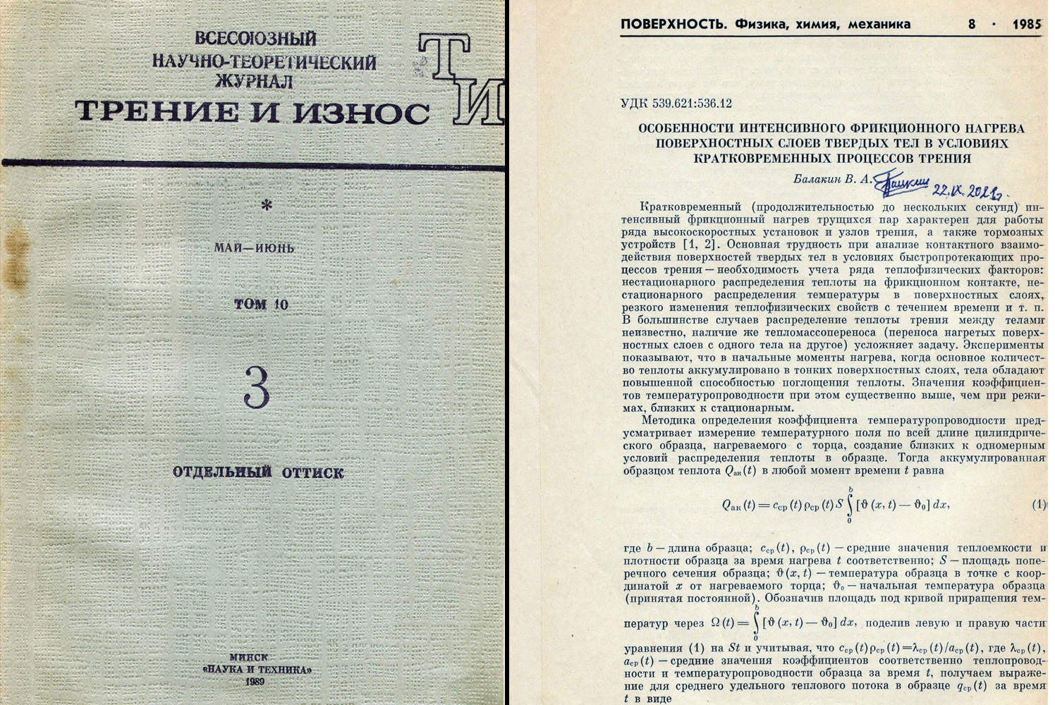 В 1962 г. В.А. Балакин поступил на учебу в заочную аспирантуру Института машиноведения (ИМАШ) АН СССР к научному руководителю – известному ученому-трибологу И.В. Крагельскому. В ИМАШ(е) В.А. Балакин регулярно посещал научные семинары, выступал на них с докладами и в 1967 г. защитил кандидатскую диссертацию на тему: «Скольжение и фрикционное торможение тележек на ракетном треке».