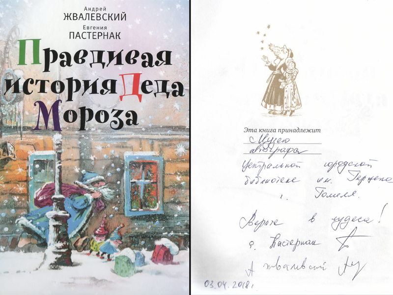 Музею автографа центральной городской библиотеке им. Герцена г. Гомеля. Верьте в чудеса! Е. Пастернак /подпись/ А. Жвалевский /подпись/ 03.04.2018 г.