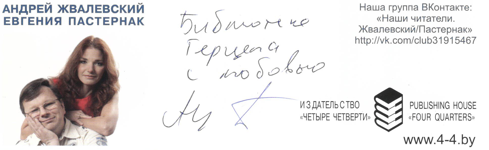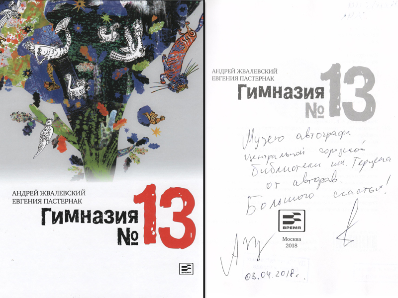 Музею автографа Центральной городской библиотеке им. Герцена от авторов. Большого счастья! Е. Пастернак /подпись/ А. Жвалевский /подпись/ 03.04.2018 г.