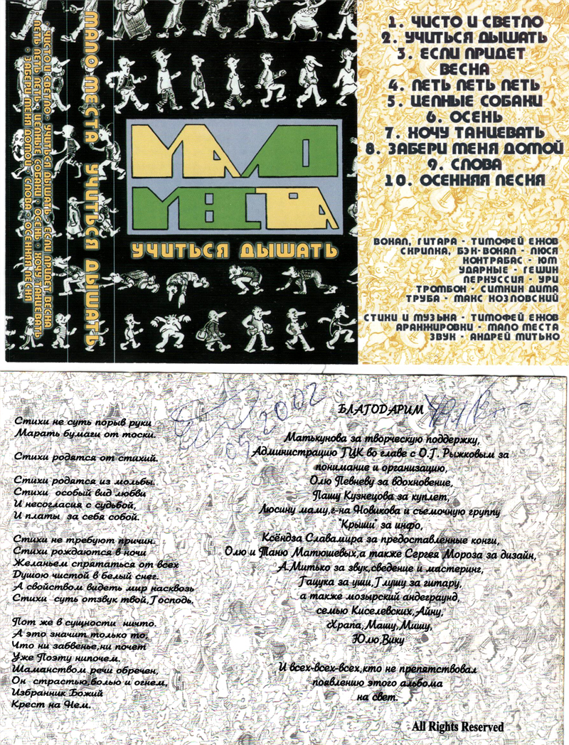 Произведения группы «Мало места» легли в основу авторского альбома (компакт-диска) «Учиться дышать» и в два коллективных компакт-диска.