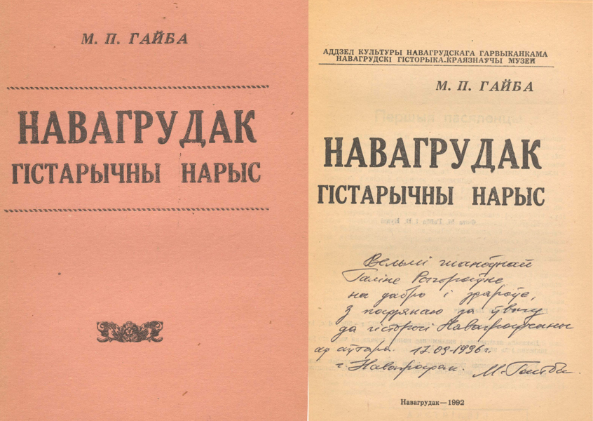 Вельмі шаноўнай Галіне Рыгораўне на дабро і здароўе, з падзякаю за ўвагу да гісторыі Навагрудчыны ад аўтара 17.09.1996г. г. Навагрудак. /Подпіс/