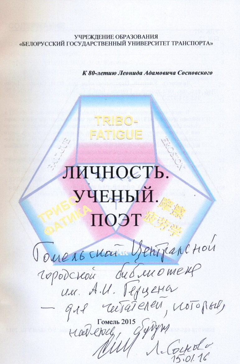 Профессор Л.А. Сосновский – доктор технических наук, Лауреат Государственной премии Украины, Заслуженный деятель науки Республики Беларусь, член Российского Национального Комитета по теоретической и прикладной механике, сопредседатель (наряду с В.Т. Трощенко, Н.А. Махутовым и Гао Ванчженом) Международного координационного совета по трибофатике, созданного Академиями наук Беларуси, России и Украины в 1993 г. почетный гражданин города Чечерска. Автор более 700 работ и изобретений. Специалист в области механики материалов и конструкций, движущихся и деформируемых систем.