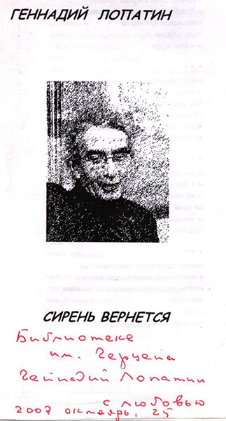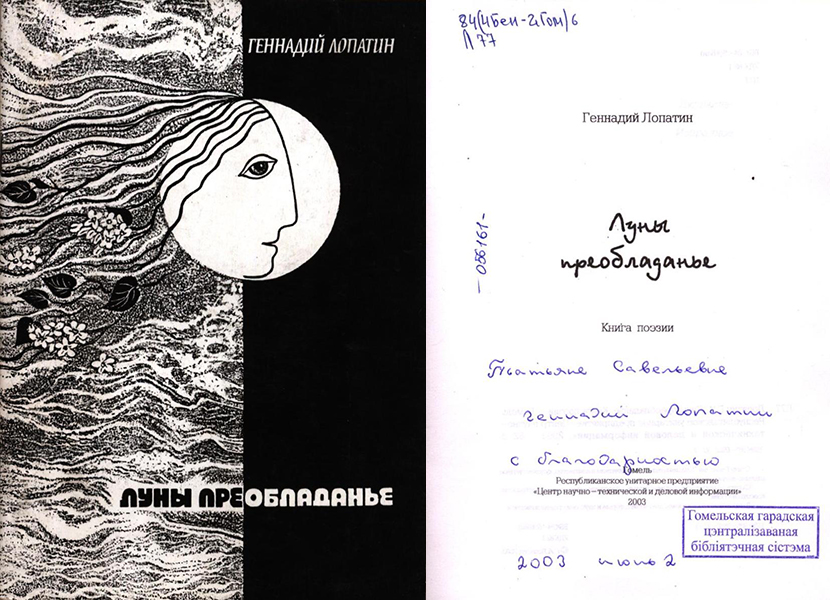 Лопатин Геннадий – гомельский русскоязычный поэт, автор книг поэзии «Лепить из снега» (2002), «Без чисел и дат» (1997, 2003), «Луны преобладанье» (2003), «Увидеть дерево» (2008), «Около облака» (2012), «Поделиться небом» (2019), многочисленных публикаций в альманахах и журналах. Постоянный гость литературно-художественного салона «Встречи на Замковой» при Гомельской городской центральной библиотеке им А.И. Герцена в 90-2000-х годах. При содействии библиотеки издан первый сборник поэзии автора.