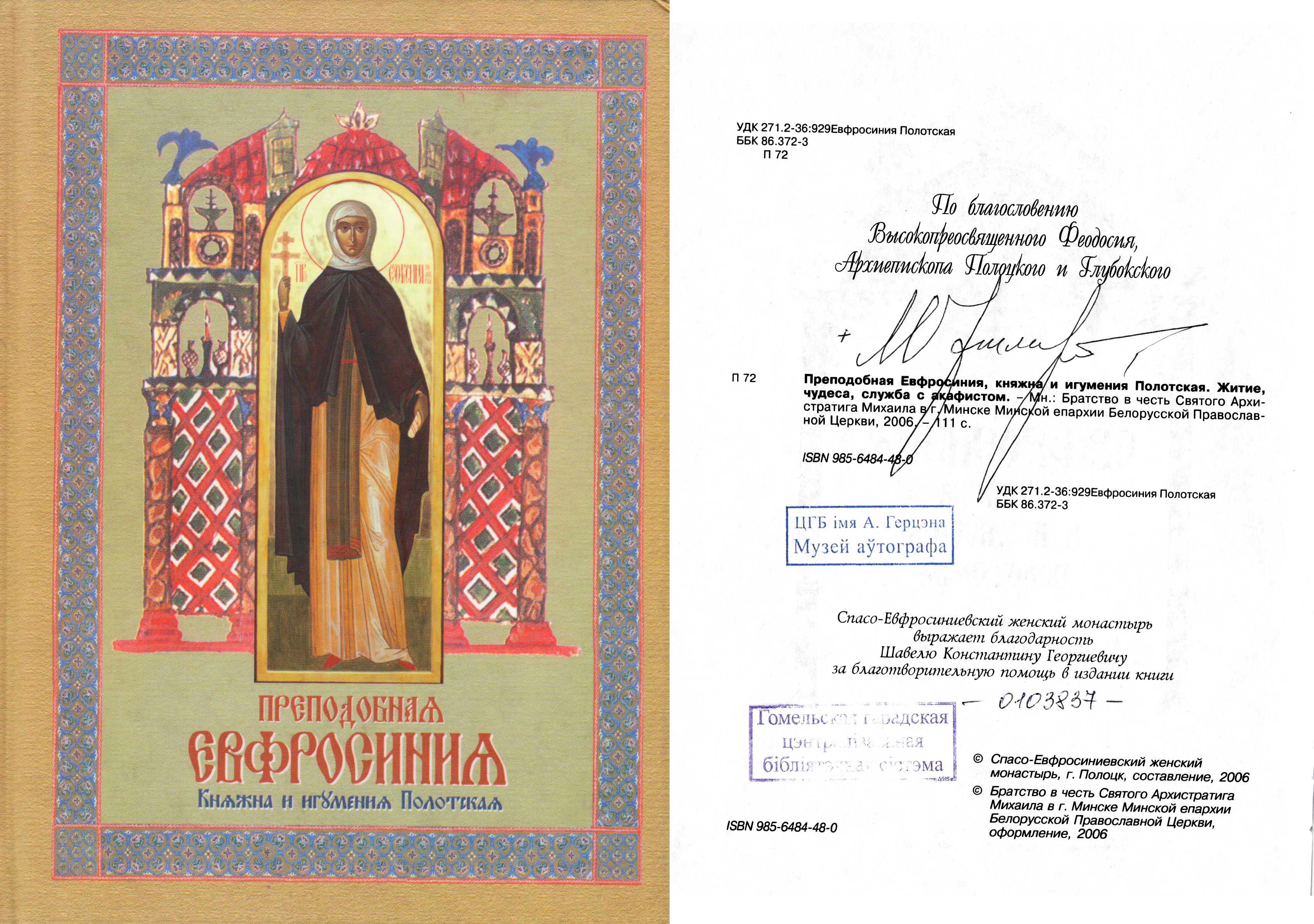 Преподобная Евфросиния, княжна и игумения Полотская : житие, чудеса, служба с акафистом / [ответственный за выпуск А. П. Маковцов]. - Минск : Православное братство в честь святого архистратига Михаила, 2006. - 111 с.