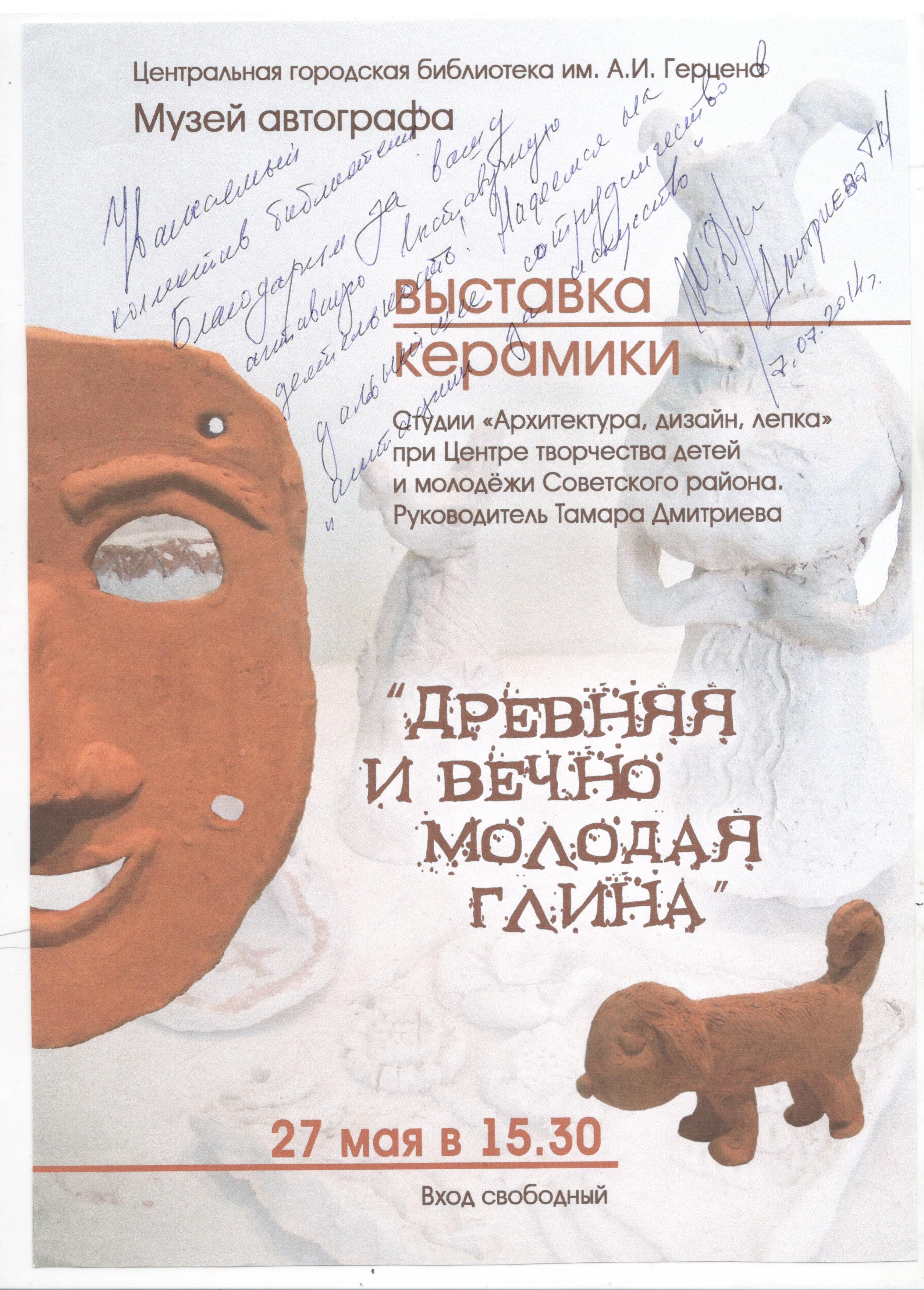 В 2014 году в музее автографа центральной городской библиотеки им. А.И. Герцена состоялась выставка керамики центра творчества детей и молодежи Советского района «Древняя и вечно молодая глина». Руководитель Тамара Дмитриева.