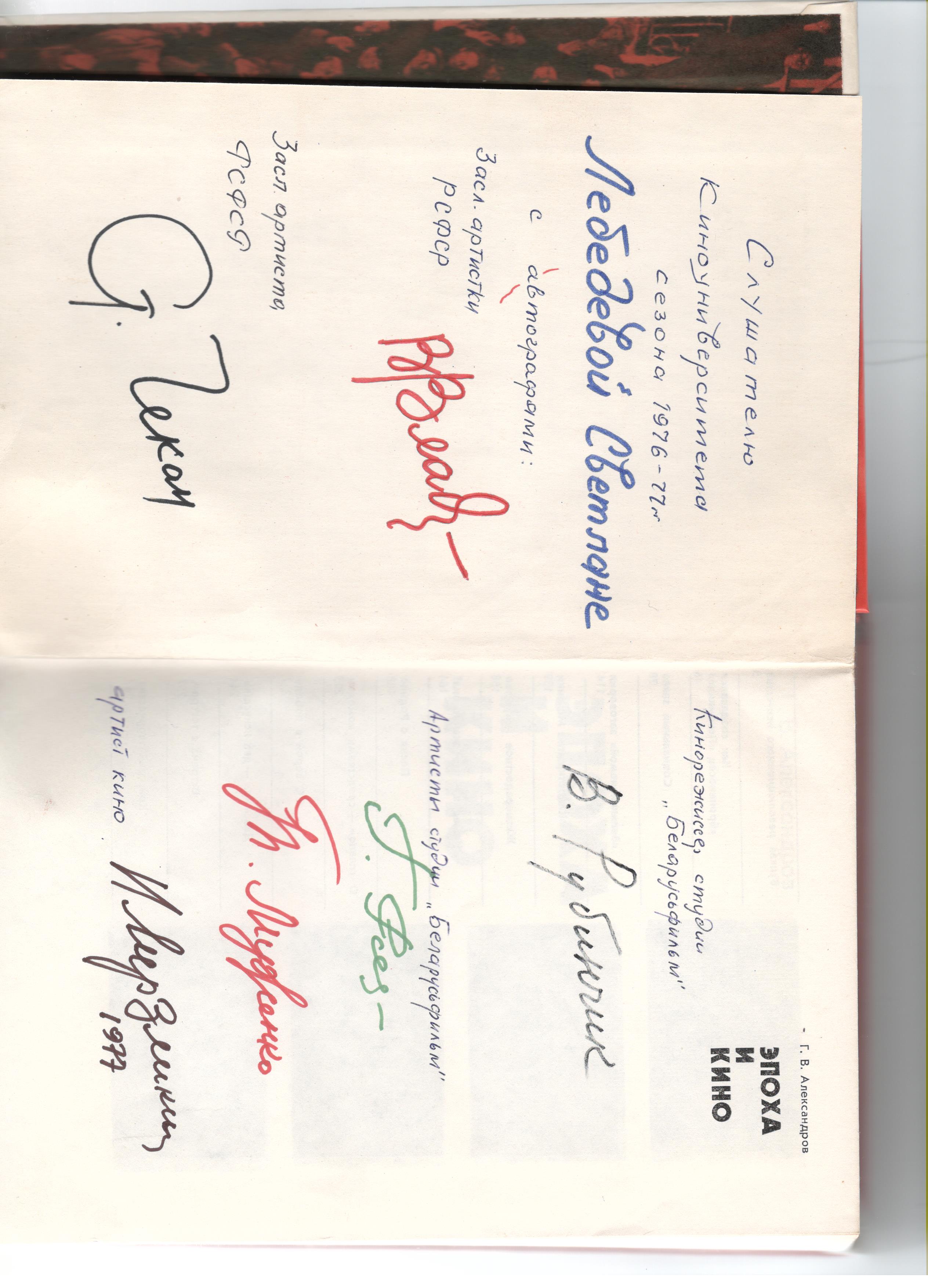 Слушателю киноуниверситета сезона 1976-77 г. Лебедевой Светлане с автографами: засл. артистки РСФСР Владимировой Валентины Харлампиевны, засл. артиста РСФСР Ст. Чекан, В. Рубинчик, (артисты студии «Беларусфильм» Г. Рес. Т. Муженко), артист кино Н. Мерзликин 1977.