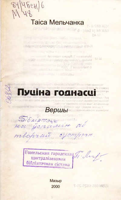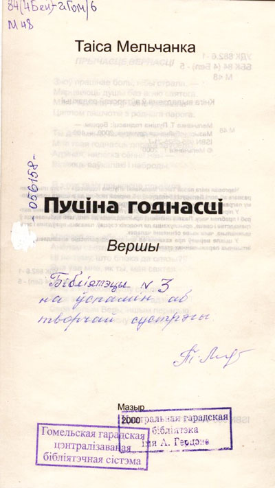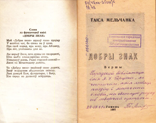 Гарадской бібліятэцы імя А. І. Герцэна, яе чытачам, якія любяць паэзію і матчына слова, на светлую згадку аб творчай сустрэчы. 22.09.97 г.