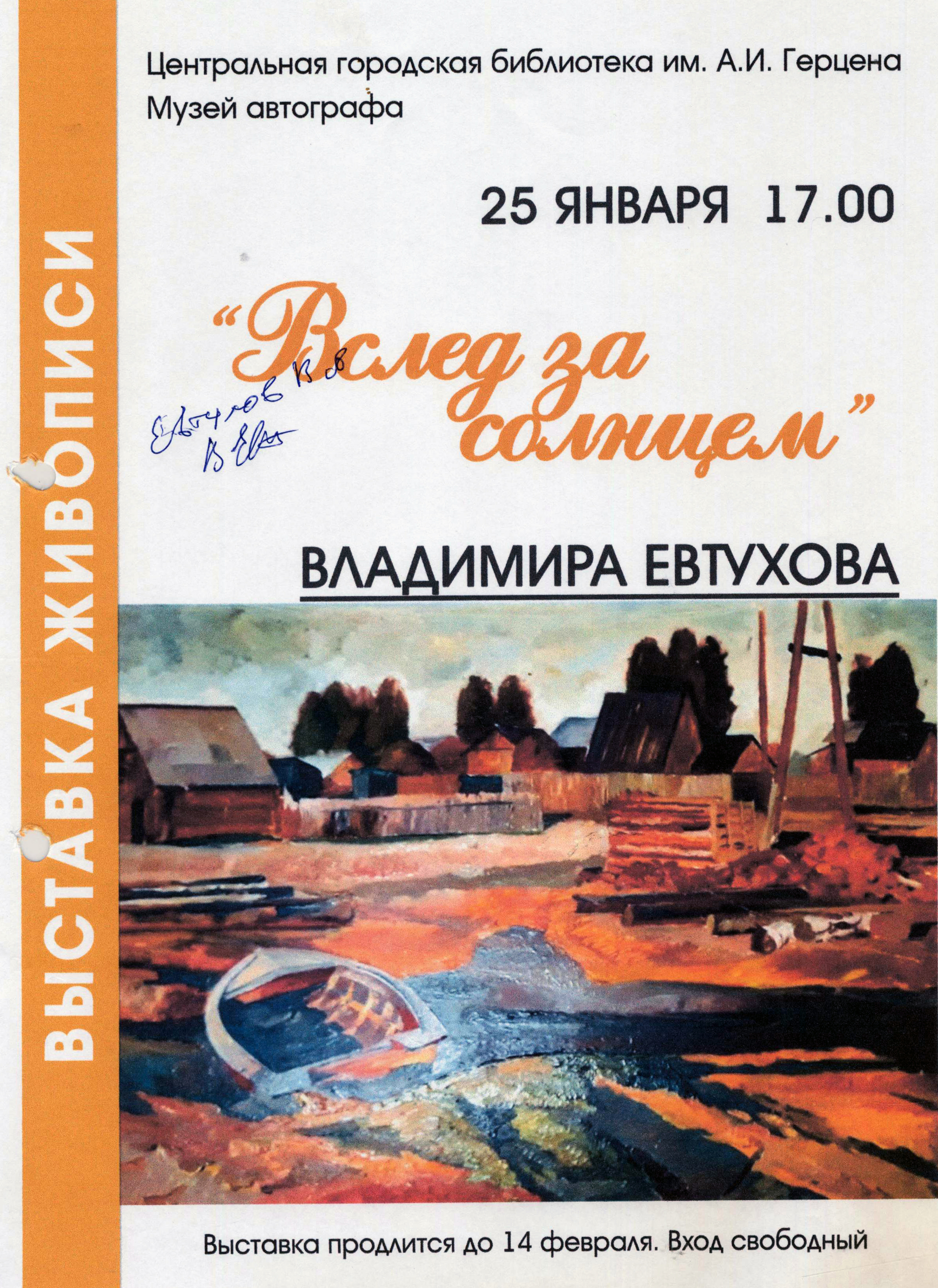 К 70-летию художника в Центральной городской библиотеке им. А. И. Герцена действовала выставка работ Владимира Евтухова «Вслед за солнцем», открытие которой состоялось в день рождения автора 25 января.