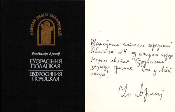 Шаноўным чытачам гарадской бібліятэкі № 4 ад шчырага сэрца. Няхай святая Еўфрасіння заўседы трымае вас ў сваёй ласцы. Ул. Арлоў.