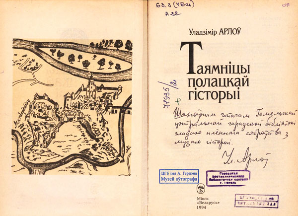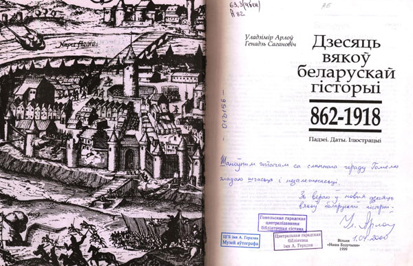 Шаноўным чытачам са слаўнага гораду Гомелю жадаю шчасця і незалежнасьці. З вераю ў новыя дзесяць вякоў беларускай гісторыі. Ул. Арлоў. 1.04.2000 г.