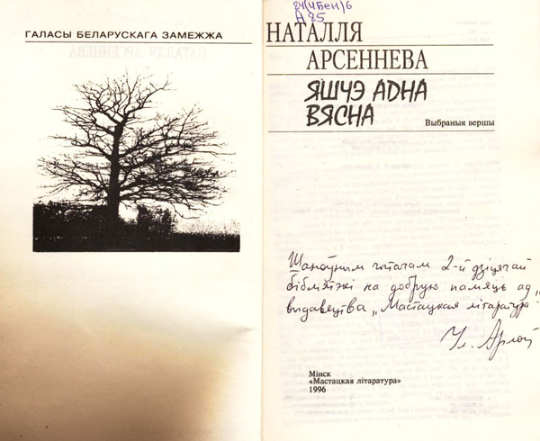 Шаноўным чытачам 2-ой дзіцячай бібліятэкі на добрую памяць ад выдавецтва “Мастацкая літаратура”. Ул. Арлоў.