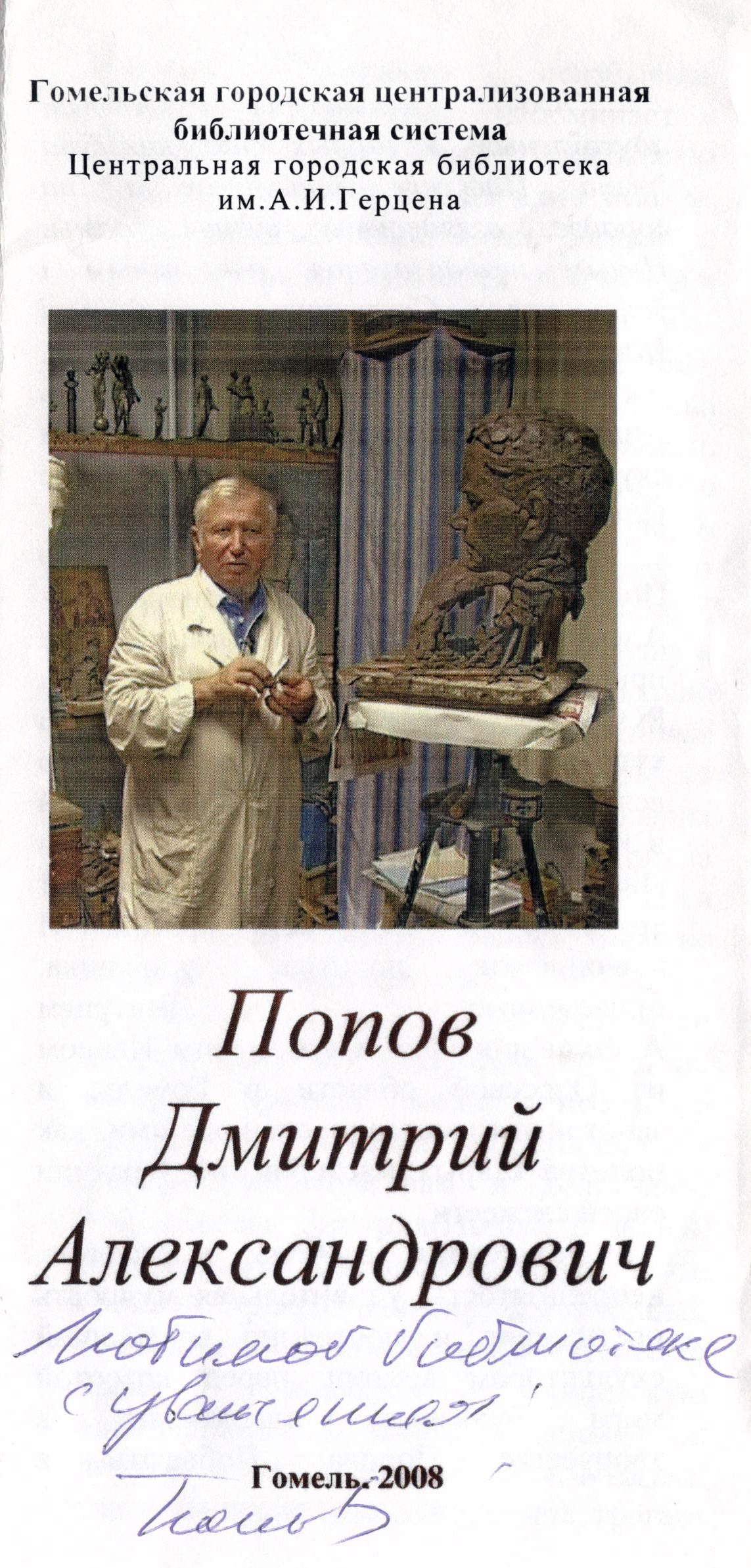 Дмитрий Александрович Попов - гомельский скульптор. Родился 25 октября 1938 года в городе Болграде Одесской области (Украина). Окончил Кишиневское художественное училище в 1959 г., в 1965 г. - Белорусский театрально-художественный институт. Учителями будущего скульптора были художник А.Ф. Майко, Народный художник Беларуси А.К. Глебов и Народный художник Беларуси А.О. Бембель.