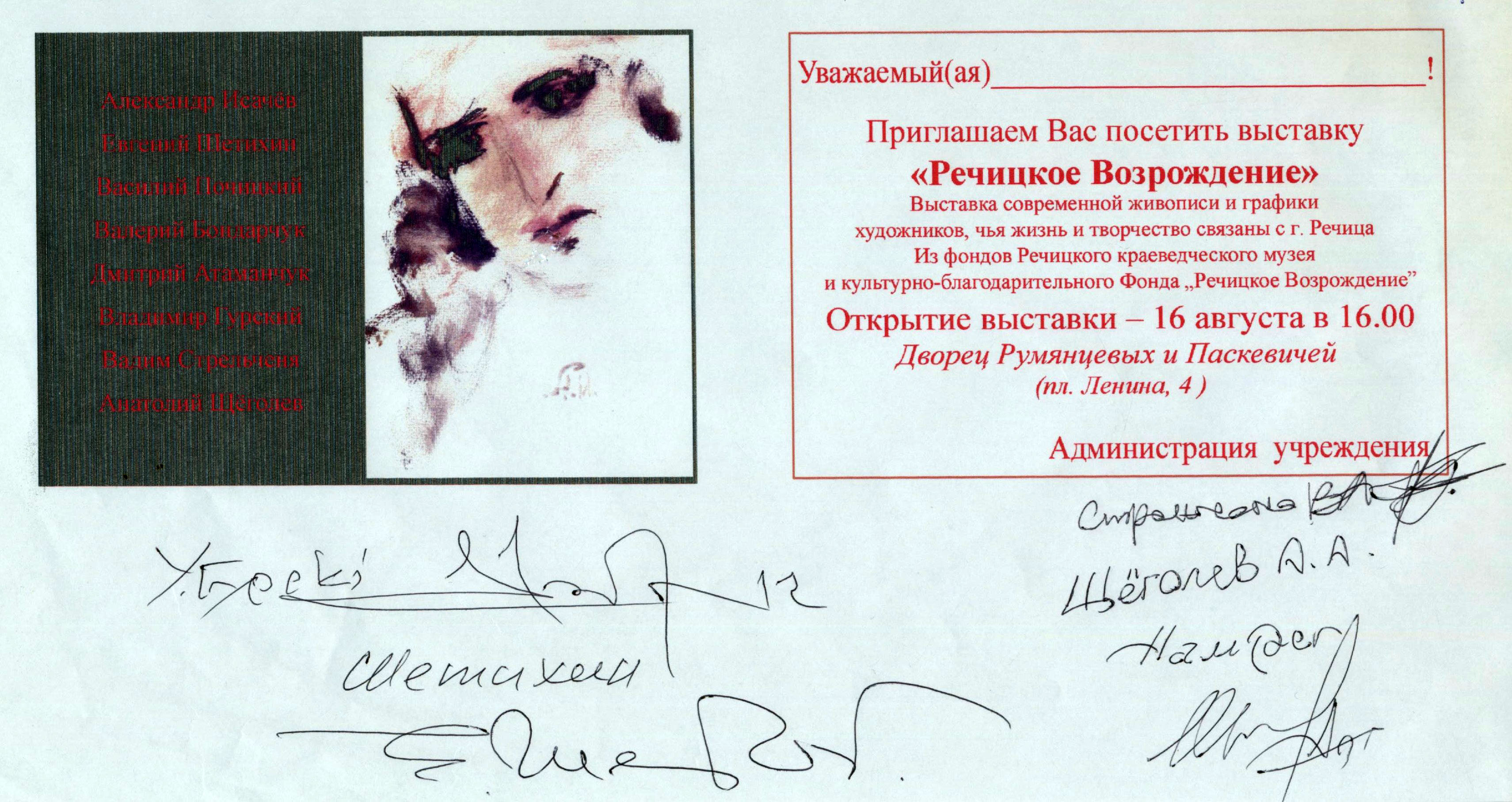 На пригласительном билете помимо Владимира Гурского оставили свои автографы художники Анатолий Щеголев, Владимир Гурский, Вадим Стрельченя, Дмитрий Атаманчук.