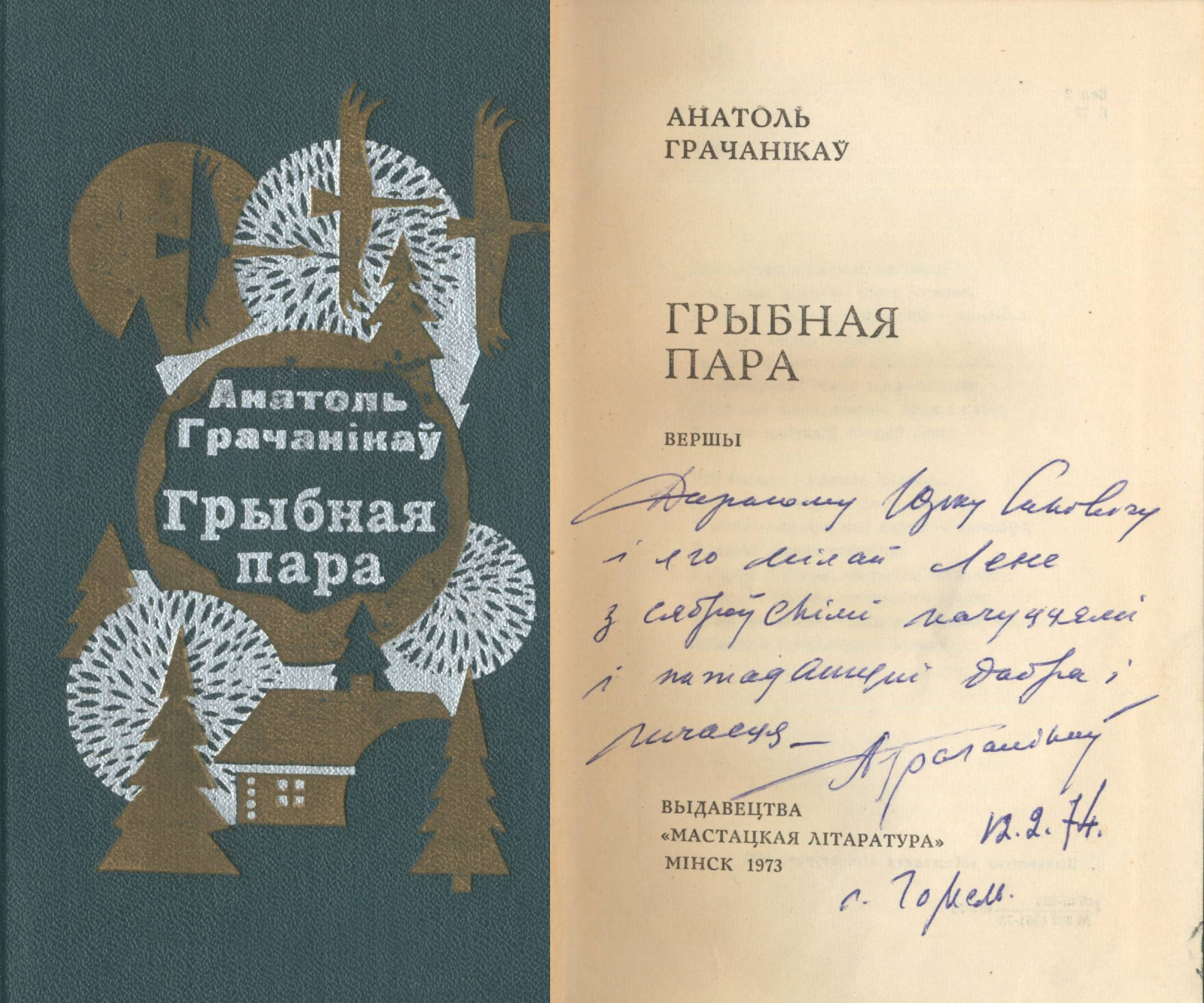 «Дарагому Юрку Саковічу і яго мілай Лене з сброўскімі пачуццямі і пажаданнямі дабра і шчасця А.Грачанікаў 12.2.74 г. Гомель»