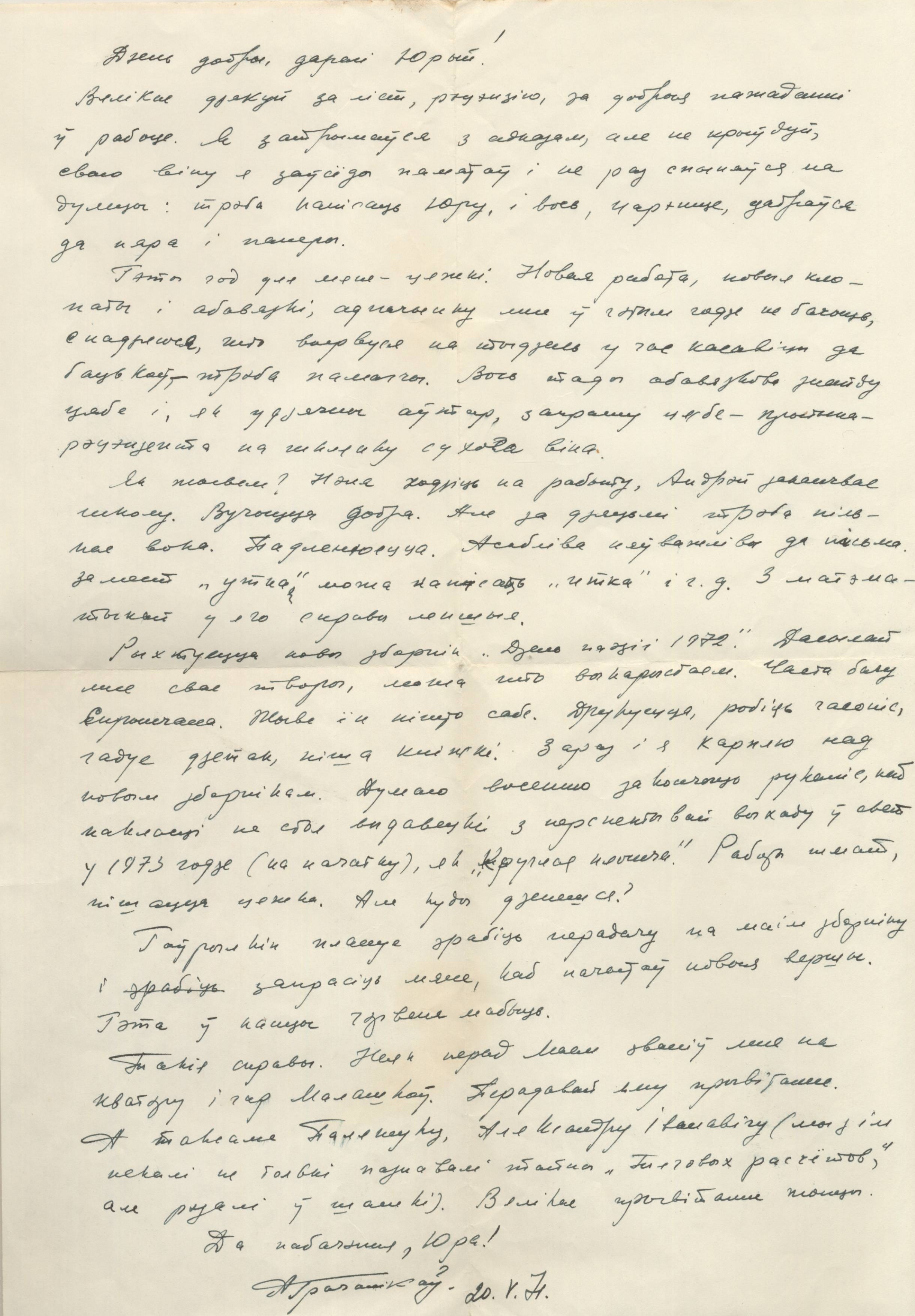 «Дзень добры, дарагі Юрый! Вялікая дзякуй за ліст, рыцэнзію, за добрыя пажаданні ў рабоце. Я затрымаўся з адказам, але не крыўдуй, сваю віну я завсёды памятаў і не раз спыняўся на думцы:трэба напісаць Юру, і вось, нарэшце, дабраўся да пяра і паперы. Гэты год для мяне – цяжкі: Новая работа, новыя клопаты і абавязкі, адпачынку мне ў гэтым годзе не бачыць, спадзяюся, что вырвуся на тыдзень у час касавіцы да бацькоў, - трэба памагчы. Вось тады абавязкова знайду цябе і як удячны автар, запрашу цябе –крытыка-рэцэнзента - на шклянку сухога віна. Як жывем? Нэла ходзіць на работу, Андрэй заканчвае школу. Вучыцца добра. Але за дзяцьмі трэба пільнае вока. Падленюецца. Асабліва няўважлівы да пісьма. За мест утка можа напісать итка і г.д. З матэматыкай у яго справы лепшыя. Рыхтуецца новы зборнік “Дзень паэзіі 1972” Дасылай мне сваі творы, можа што выкарыстаем. Часта бачу Спрынчана. Жыве ён нішто сабе. Друкуецца, робіць часопіс, гадуе дзетак, піша кніжкі. Зараз і я каплю над новым зборнікам. Думаю восенню закончыць рукапіс каб пакласці з перспектывай выхаду ў свет на стол выдавецкі у 1973 годзе (на пачатку), як “Круглая плошча” работы шмат, пішацца цяжка. Але куды дзенешся? Гаўрылкін плануе зрабіць перадачу па маім зборніку і запрасіць мяне, каб пачытаў новыя вершы. Гэта у канцы чэрвеня мабыць. Такія справы. Неяк перад маем званіў мне на кватэру Ігар Малашкаў. Перадавай яму прывітанне. А таксама Паляшуку, Аляксандру Іванавічу ( мы з ім некалі не толькі пазнавалі тайны “Тяговых расчётов”, але рэзалі ў шашкі). Вялікае прывітанне жонцы. Да пабачэння, Юра! Аграчанікаў. 20.V/71»