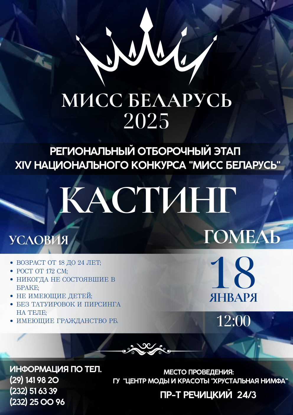 18 января в 12.00 в ГУ «Центр моды и красоты «Хрустальная нимфа» пройдет региональный кастинг Национального конкурса красоты «МИСС БЕЛАРУСЬ»