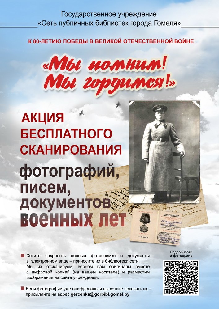 Государственное учреждение «Сеть публичных библиотек города Гомеля» проводит акцию бесплатного сканирования фотографий, писем и документов военных лет «Мы помним! Мы гордимся!» и собирает воспоминания о событиях Великой Отечественной войны.Стартовала акция в 2014 году и была приурочена к 70-летию освобождения Республики Беларусь от немецко-фашистских захватчиков. В 2015, в год 70-летия Победы в Великой Отечественной войне, она была продолжена. Тогда в рамках акции также записывались воспоминания гомельчан о том, что происходило с их родителями, бабушками, дедушками и другими родственниками в годы войны.