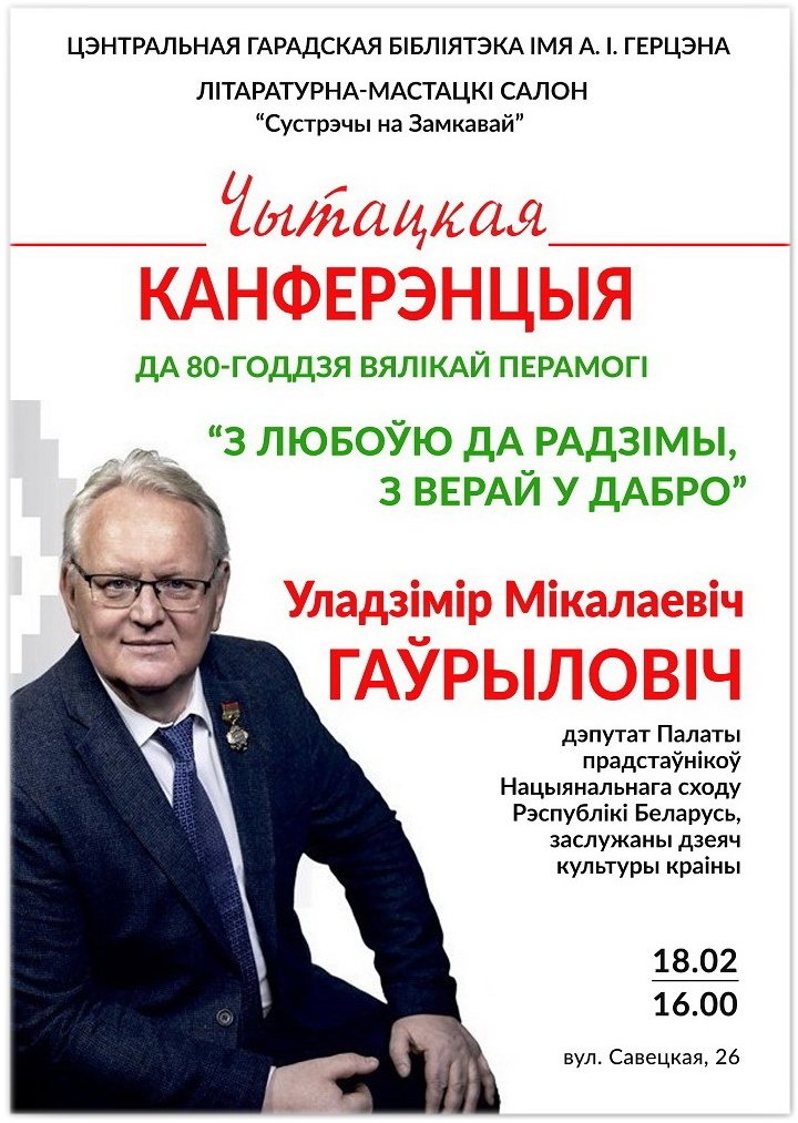 18 февраля в 16.00 в литературно-художественном салоне «Встречи на Замковой» центральной городской библиотеки им. А.И. Герцена состоится читательская конференция “З любоўю да Радзімы, з верай у дабро” к 80-летию Великой Победы по книгам Владимира Николаевича Гавриловича, депутата Палаты представителей Национального собрания Республики Беларусь, заслуженного деятеля культуры Республики Беларусь.