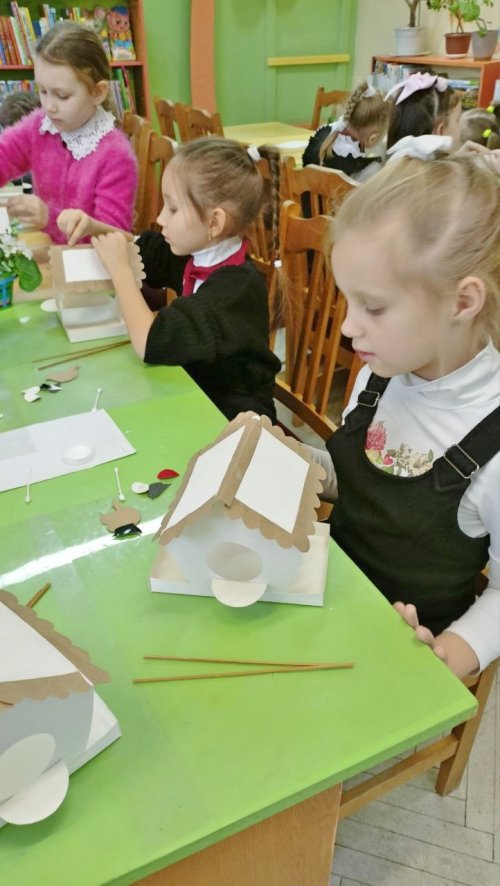 Первоклассники, послушав и обсудив стихи Николая Рубцова и Александра Яшина, приступили к изготовлению кормушек.