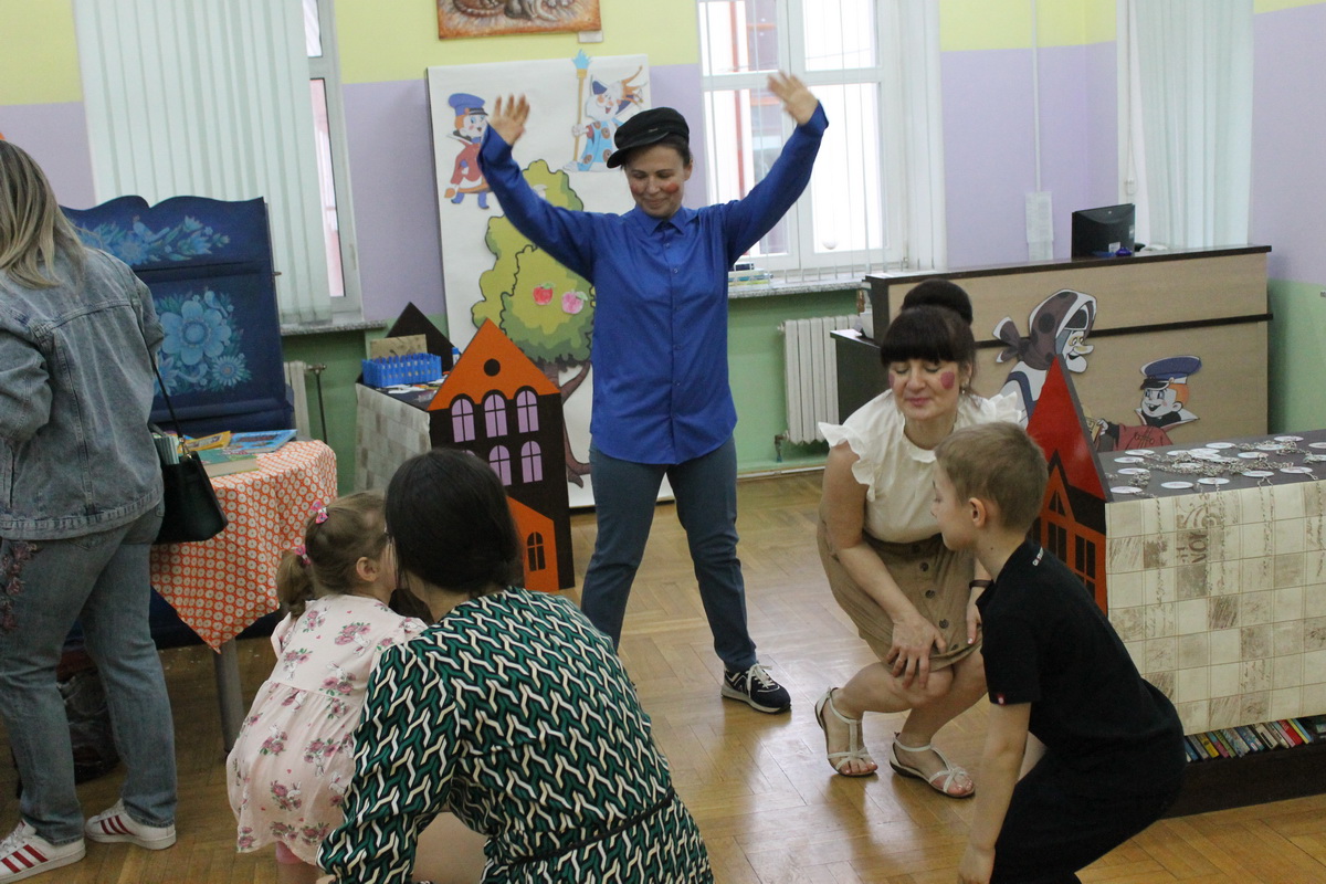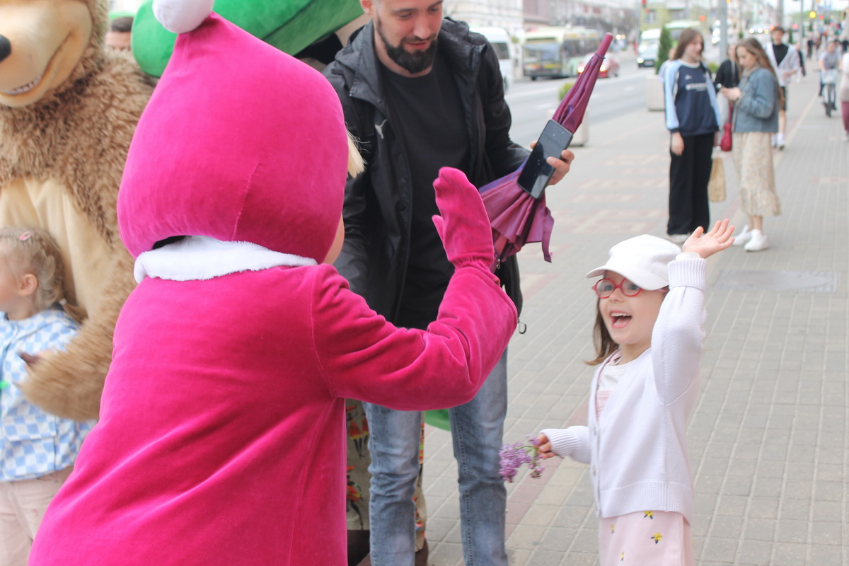 У центрального входа в библиотеку можно было потанцевать и сфотографироваться с ростовыми куклами Гомельского государственного театра кукол: Чебурашкой, крокодилом Геной, Машей и Медведем.