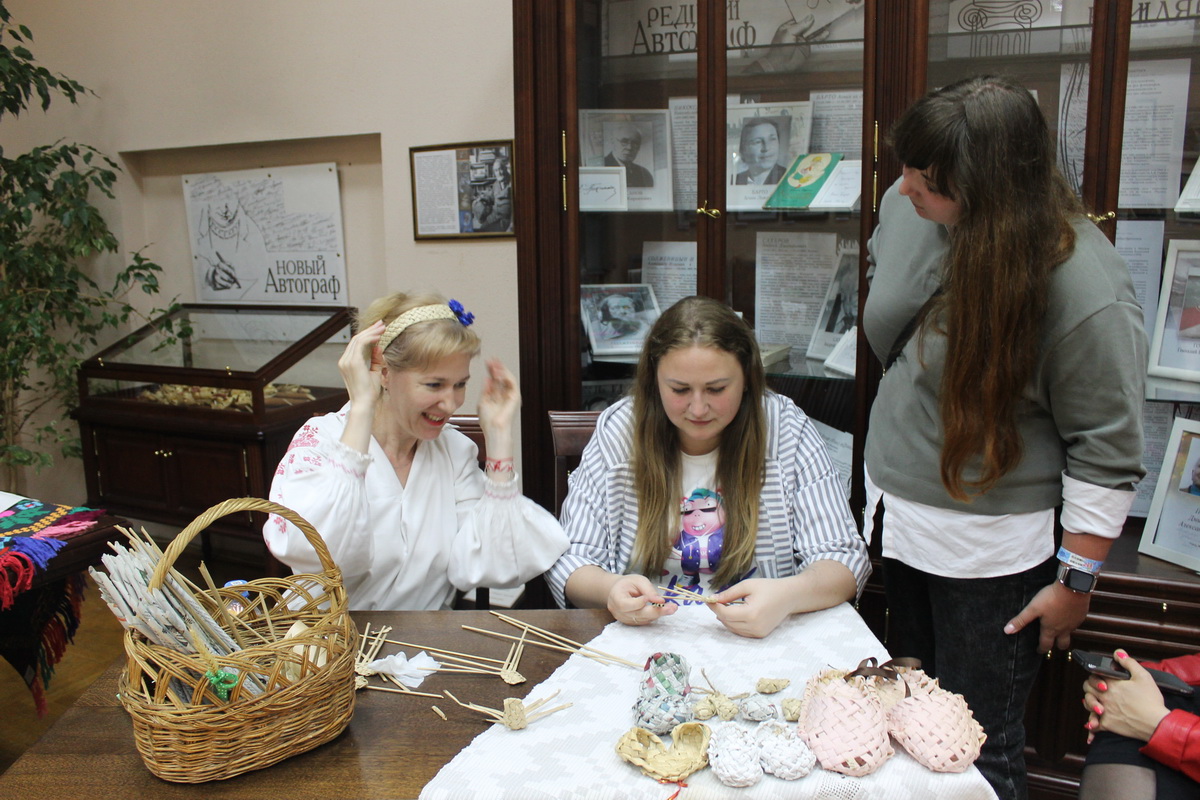 На этой же площадке сотрудник центральной городской библиотеки им. А.И. Герцена учила гостей плетению лаптей из газетных трубочек.