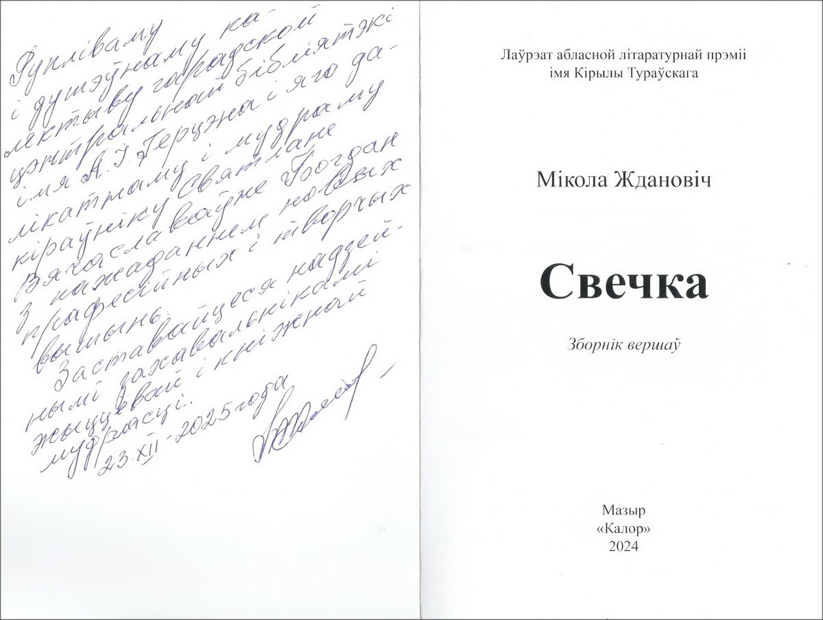 Главным событием уходящего года в творчестве автора стала победа в номинации «Лучшее произведение (сборник произведений) поэзии» Национальной литературной премии 2025 года. Награду за сборник стихов «Свечка» Николай Жданович получил на праздновании Дня белорусской письменности в городе Лида. Поэт рассказал, что книга объединила стихи разных лет, где образ свечи символизирует свет, тепло и вдохновение. В конце встречи прозвучала песня «Свечка» на стихи Николая Ждановича.
