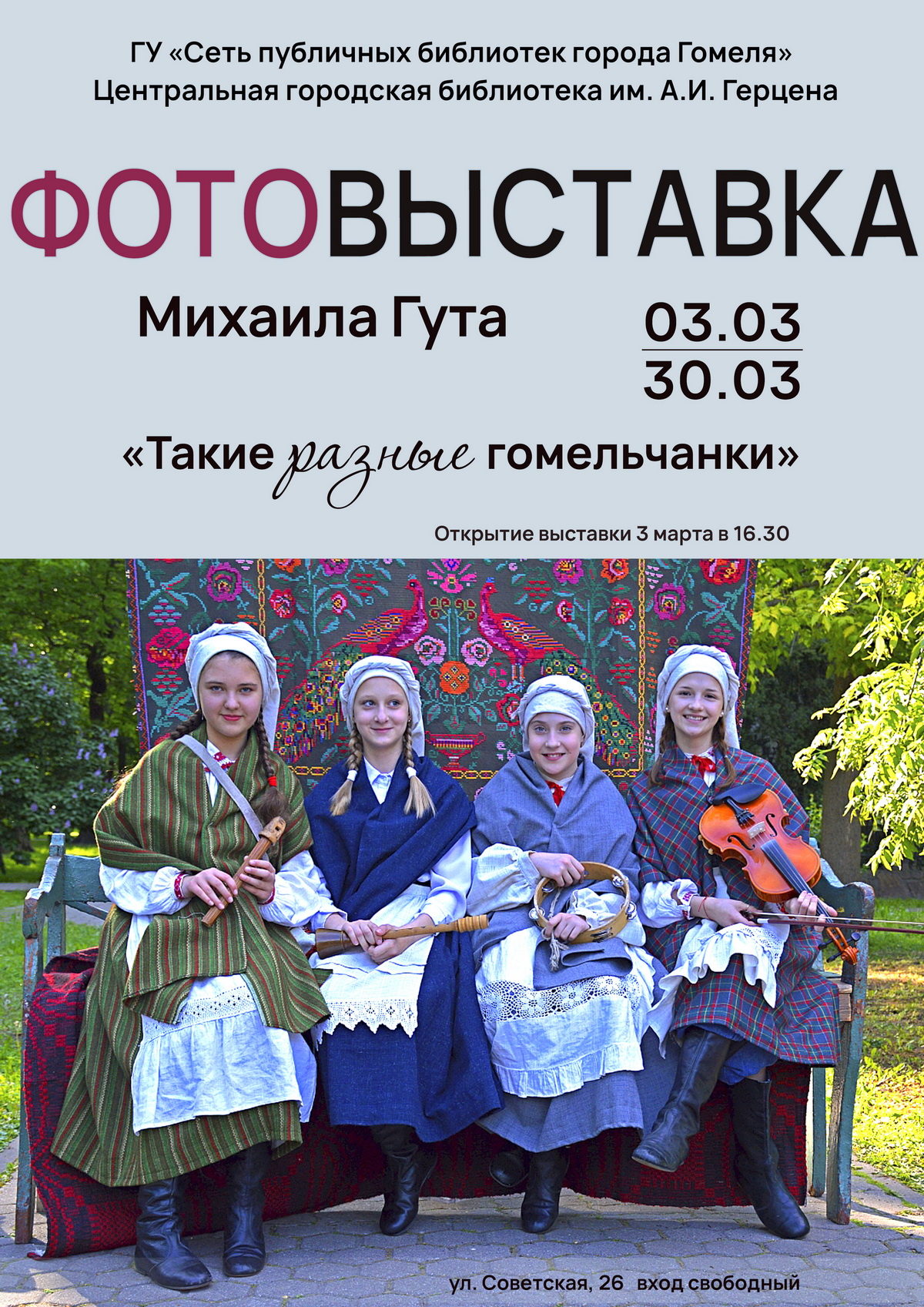 В преддверии Дня женщин, 3 марта в 16.30 в центральной городской библиотеке им. А.И. Герцена в рамках цикла мероприятий к Году белорусской женщины и проекта «Живой автограф» состоится открытие фотовыставки Михаила Гута «Такие разные гомельчанки».Весеннюю экспозицию составят 20 снимков, сделанных в 2015-2026 годах, главными героинями которых стали прекрасные гомельчанки. Все они заняты своим делом: исполняют танец, играют роль на мероприятии или просто позируют. Михаил Гут зафиксировал атмосферу городских праздников, настроение людей, необычные наряды участниц. В каждой фотографии свой сюжет и свои эмоции.
